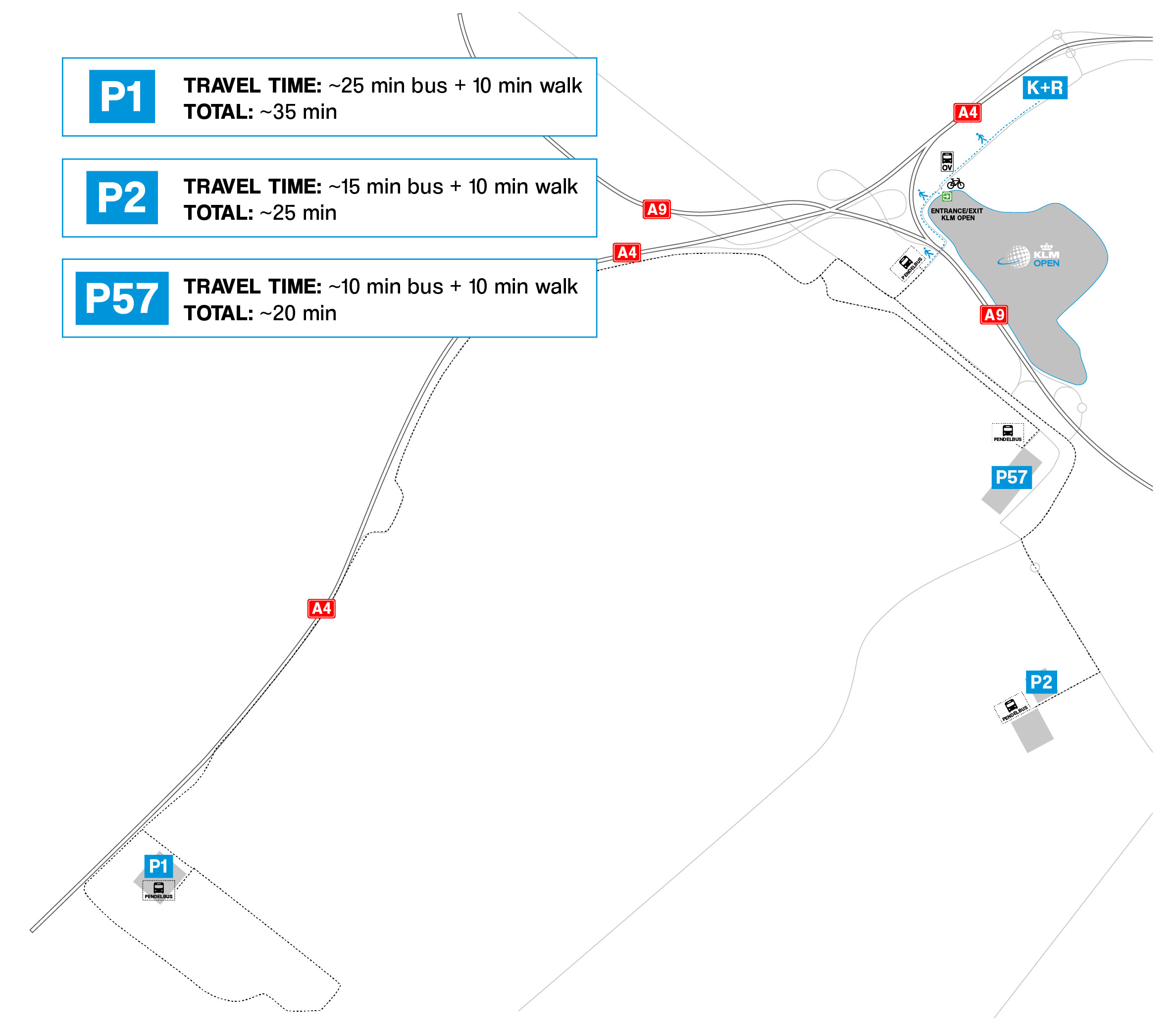 Coming by taxi or being driven to the KLM Open? Then follow the Kiss & Ride signs. The Kiss & Ride location is on the Oude Haagseweg on the Amsterdam side. From here it is a 10-minute walk to the official entrance of the tournament.